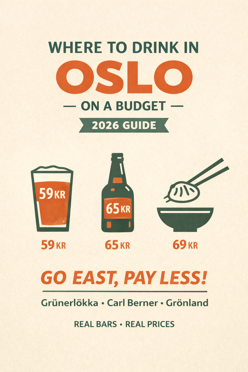 The single most reliable way to drink cheaply in Oslo is to stay east of the city centre. The neighbourhoods of Grünerløkka, Carl Berner, Sagene, Torshov, and Grønland consistently have the lowest average prices in the city. The further west you go — towards Frogner, Aker Brygge, and Tjuvholmen — the more you're paying for the postcode rather than the pint.